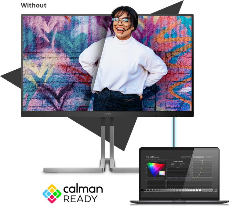 Calman Ready-displays en -apparaten zijn uitgerust met de mogelijkheid om rechtstreeks te communiceren met de Calman®-kleurkalibratiesoftware van Portrait Displays. Apparaten die Calman Ready zijn, kunnen snel verbinding maken met de software en gebruikmaken van de nauwkeurige en geautomatiseerde kalibratiemogelijkheden (AutoCal™). Calman Ready zorgt voor eenvoudige, nauwkeurige en snelle kalibraties met uw gloednieuwe AOC-display.