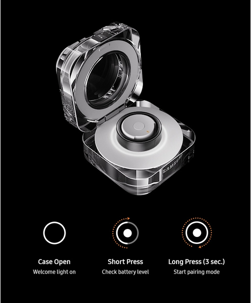 Even while charging in its crystal-clear Charging Case, the Galaxy Ring is a sight to behold. The delicate glow of the light around the Multi-purpose button indicates the battery charging level. The Charging Case can be charged wirelessly too, so simply place your Galaxy Ring securely in its case when you're on the go, and place it on a wireless charging pad for easy charging.